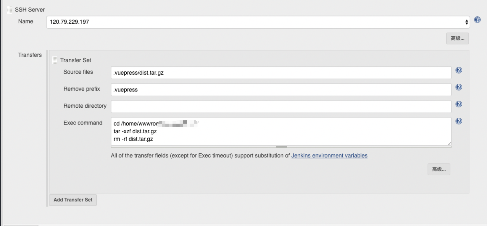 下拉任务名字->配置->构建后操作->Send build artifacts over SSH