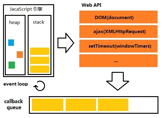 主线程运行的时候,产生堆(heap)和栈(stack),栈中的代码调用各种外部API, 它们在"任务队列"中加入各种事件(click,load,done)。只要栈中的代码执行完毕,主线程就会去读取"任务队列(task queue)",依次执行那些事件所对应的回调函数